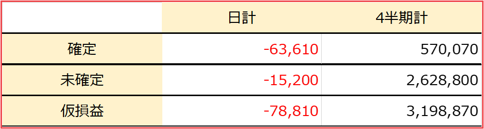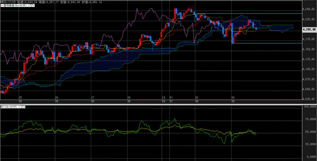 0時に長い陰線が入り、その後は回収されていく流れ。遅行線と実体の位置が微妙で、停滞すると考えるのが自然か。4,170ドル~4,220ドルが、一旦は中心値。