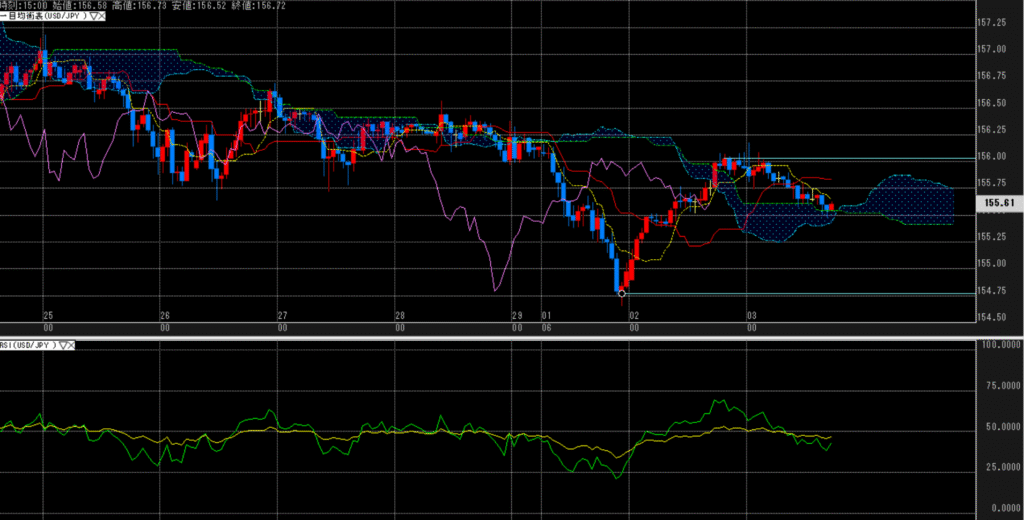 値位置(一目均衡表):日足は転換・基準線の仲値を小幅で往復、時間足は雲の上にあるも、各線の下に実線があり、強い時間帯ではない。雲の流れも微妙である。