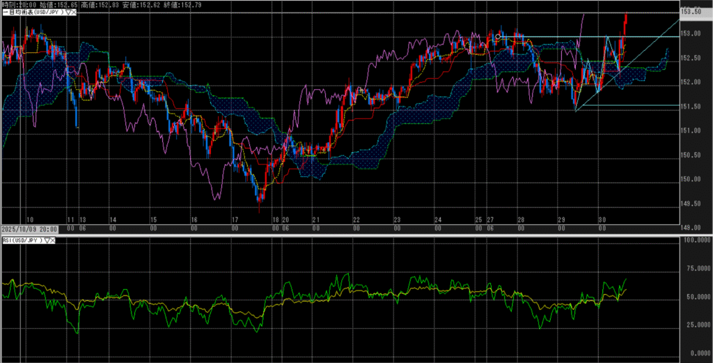 :目先レジスタンスの153円を突破、三役好転となる。