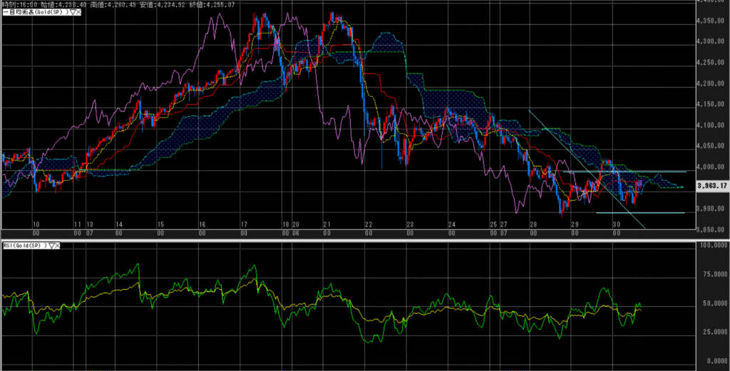 値位置(一目均衡表):再び、雲を下抜けるも復活したが、雲の中で保ち合い。4,000ドルが意識されるのか。