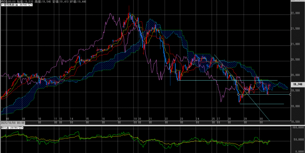:日足で見ると、結局は28日の特大陰線のレンジ内の動き。時間足は雲の中にあり、強い状況ではない。